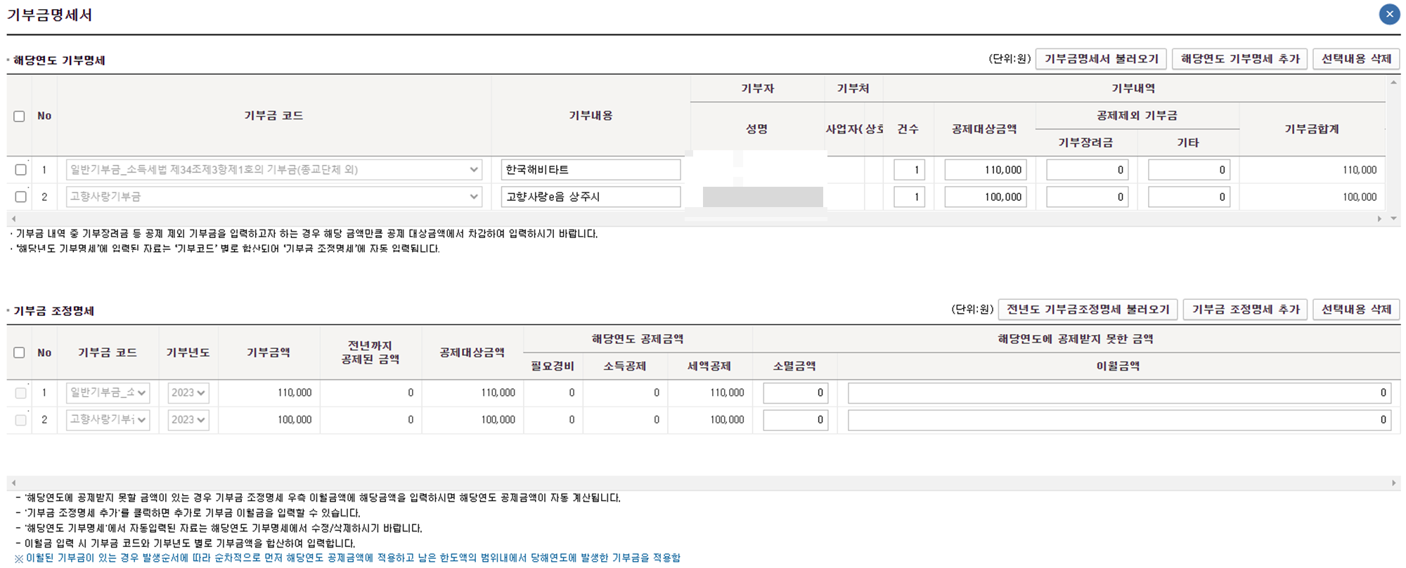 기부금 세액공제 - 기부금 명세서 버튼 클릭-기부내역 입력
