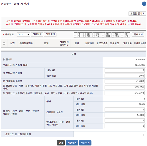 계산하기 버튼 클릭 -본인의 통장 종류/가입일자 확인 후 입력- 01.01~12.31 중 납입금액 전액 입력-적용하기