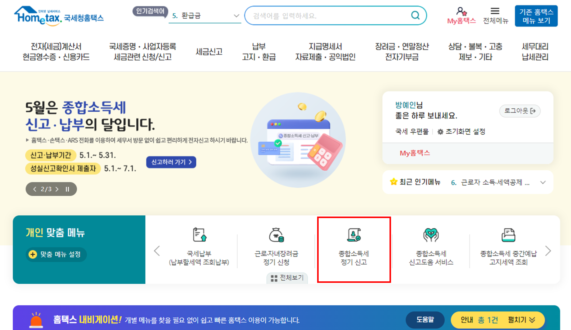 로그인 - 종합소득세 정기신고-정기신고-개인정보입력 후 다음 페이지