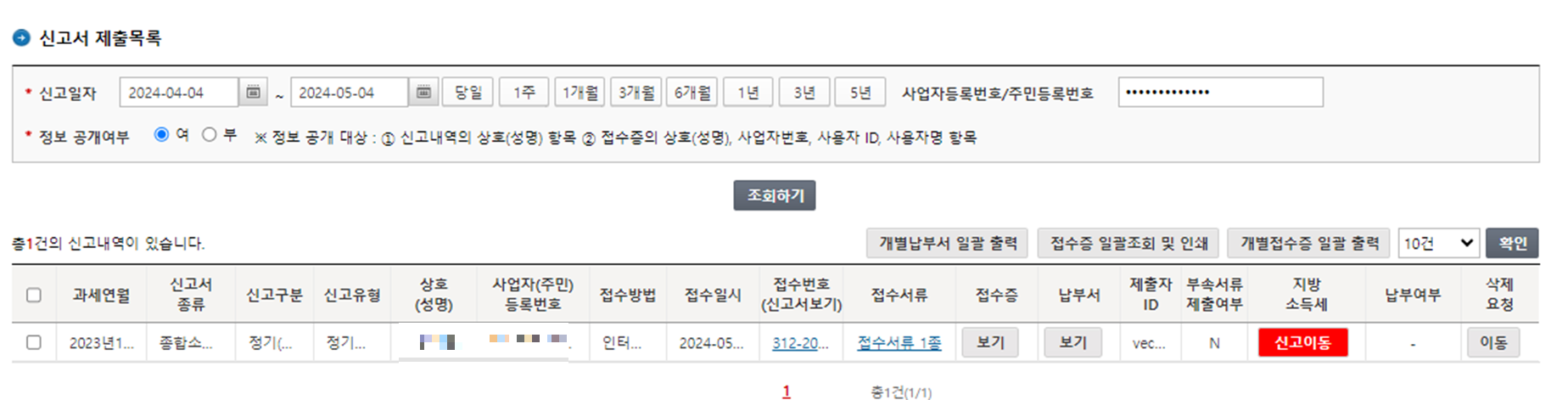 종합소득세 신고 후 신고내역 확인 화면으로 자동으로 넘어간다.