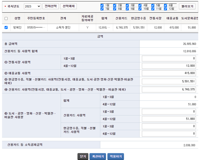 연말정산간소화불러오기-귀속년도(2023년)-전체선택-불러오기-계산하기-적용하기