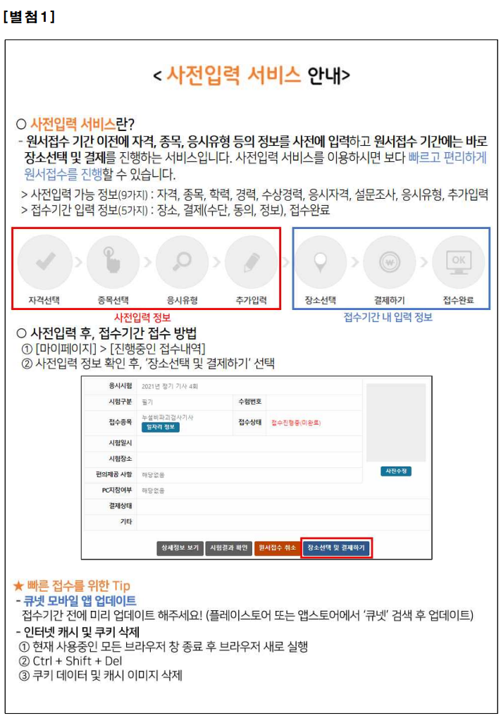 큐넷은 사전 입력 서비스를 제공하므로, 무조건 사전입력 기간에 입력해놓아야 한다. 그래야지 접수할 때, 그냥 마이페이지에서 몇번 클릭하면 될 것을 수십번의 대기 지옥에 갇혀서 스트레스만 크게 받을 수 있다.