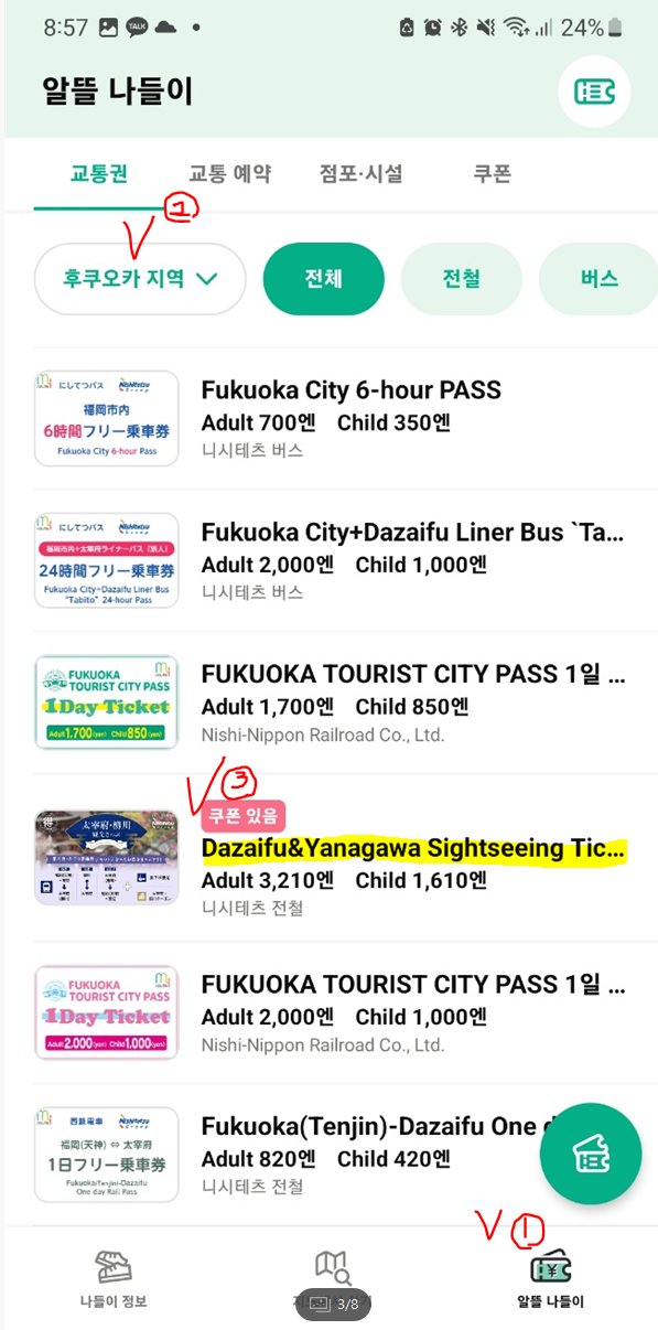 3) 메인 화면에서 가장 아래의 아이콘 3개 중 알뜰 나들이 아이콘으로 들어간 후, 지역을 후쿠오카 지역으로 선택, Dazaifu&Yanagawa sightseeing 을 클릭하여 들어간다.