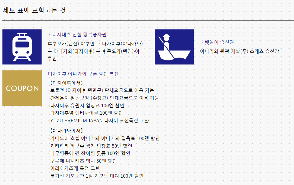 전철 왕복 승차권(텐진/야쿠인-다자이후/야나가와-야나가와/다자이후-텐진/야쿠인) + 야나가와 뱃놀이 승선권 + 관광자용 할인쿠폰