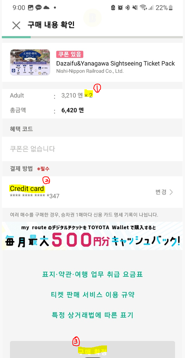 5) 원하는 티켓 수가 맞는 지 다시한번 확인하고, 결제방법에서 해외결제가 되는 카드번호를 입력하고, 구매확정을 누른다.