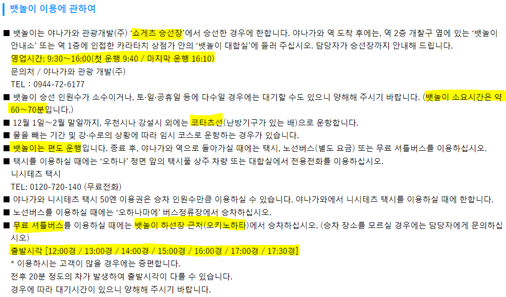 - 무료 셔틀버스 탑승 (오키노하타) : 12시, 13시, 14시,15시,16시,17시, 17시 반